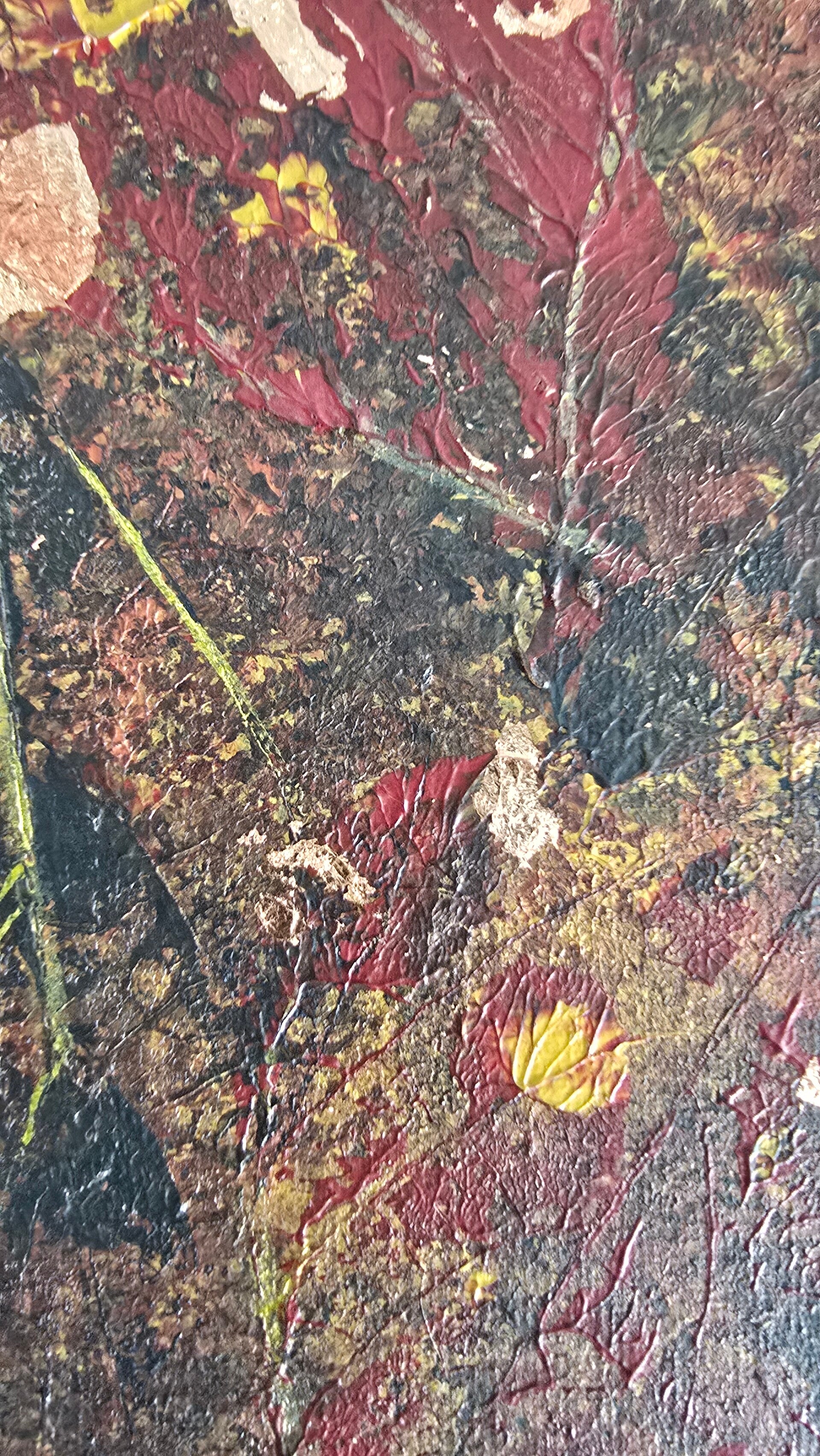 This large-scale hand-painted canvas presents a nocturnal woodland scene with two central figures: a stag and a doe. Executed in layered acrylics, the palette emphasizes deep browns, burnt umber, and subdued crimson, creating a dramatic atmospheric depth. The artist employs gold leaf with restraint, primarily to accentuate the contours of the deer and select areas of foliage, producing subtle luminous highlights that shift with the viewer’s perspective.